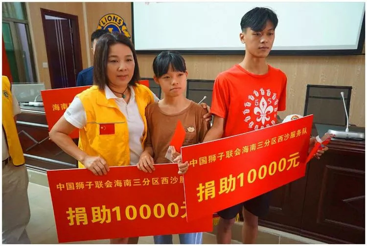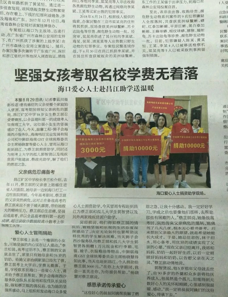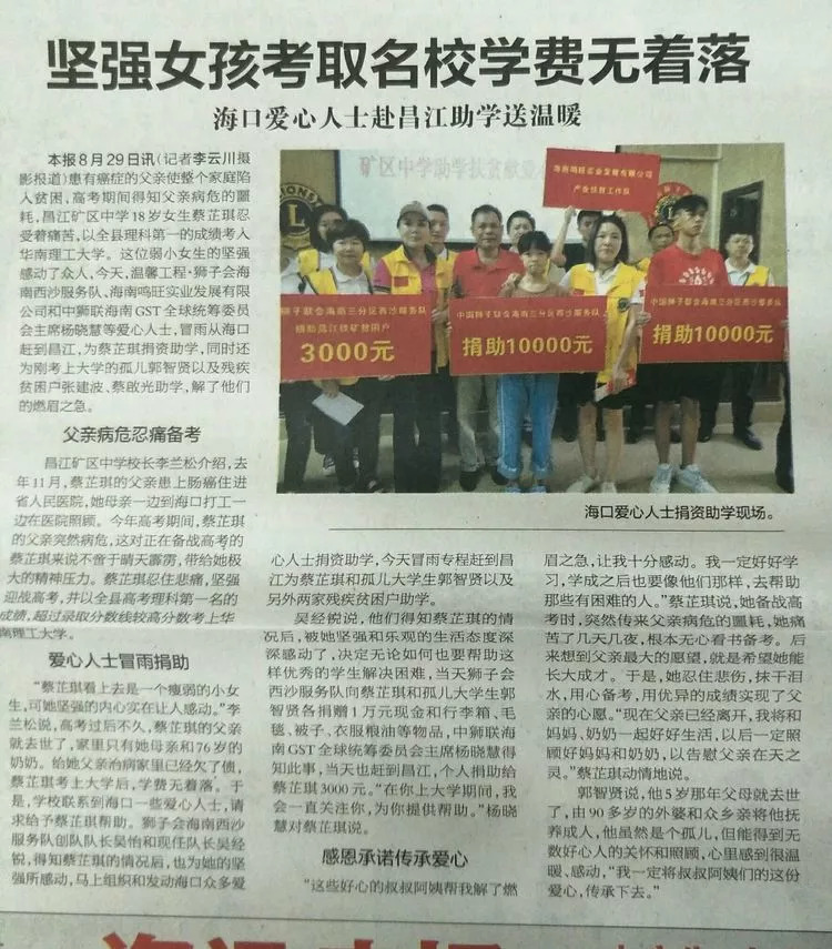 愛心人士冒雨捐助 “蔡芷琪看上去是一個(gè)瘦弱的小女生,可她堅(jiān)強(qiáng)的內(nèi)心實(shí)在讓人感動?!崩钐m松說,高考過后不久,蔡芷琪的父親就去世了,家里只有她母親和76歲的奶奶。給她父親治病家里已經(jīng)欠了債,蔡芷琪考上大學(xué)后,學(xué)費(fèi)無著落。于是,學(xué)校聯(lián)系到??谝恍坌娜耸?,請求給予蔡芷琪幫助。海南西沙服務(wù)隊(duì)創(chuàng)隊(duì)隊(duì)長吳怡和現(xiàn)任隊(duì)長吳經(jīng)銳,得知蔡芷琪的情況后,也為她的堅(jiān)強(qiáng)所感動,馬上組織和發(fā)動??诒姸鄲坌娜耸烤栀Y助學(xué),今天冒雨專程趕到昌江為蔡芷琪和孤兒大學(xué)生郭智賢以及另外兩家殘疾貧困戶助學(xué)。吳經(jīng)銳說,他們得知蔡芷琪的情況后,被她堅(jiān)強(qiáng)和樂觀的生活態(tài)度深深感動了,決定無論如何也要幫助這樣優(yōu)秀的學(xué)生解決困難,當(dāng)天獅子會西沙服務(wù)隊(duì)向蔡芷琪和孤兒大學(xué)生郭智賢各捐贈1萬元現(xiàn)金和行李箱、毛毯、被子、衣服糧油等物品,中獅聯(lián)海南GST全球統(tǒng)籌委員會主席楊曉慧得知此事,當(dāng)天也趕到昌江,個(gè)人捐助給蔡芷琪3000元;他們西沙服務(wù)隊(duì)同時(shí)給兩家貧困戶各捐贈3000元現(xiàn)金和糧油等生活物?!霸谀闵洗髮W(xué)期間,我會一直關(guān)注你,為你提供幫助。”楊曉慧對蔡芷琪說。